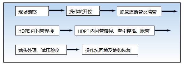 原理:通過對與修復(fù)管道同徑或略小一點(diǎn)的HDPE的縮徑、穿插、脹管等主要工序,實(shí)現(xiàn)修復(fù)管道內(nèi)形成與原管道內(nèi)壁緊密貼合的復(fù)合管。